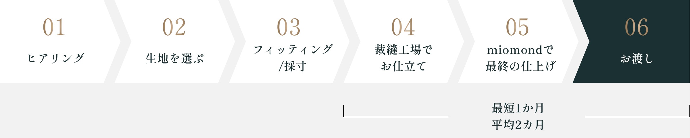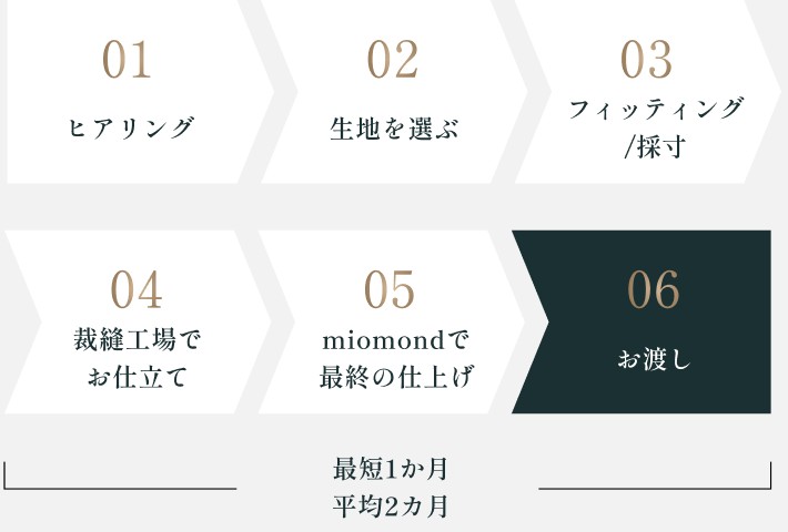 測定したサイズをもとに、専門の工場にてひとつずつ丁寧に縫製を行います。期間の目安は1~2ヶ月ほど。完成を楽しみにお待ちください。